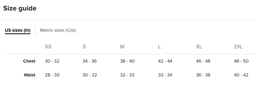 | Chest (inches) | 34-36 | 38-40 | 42-44 | 46-48 | 48-50 |
